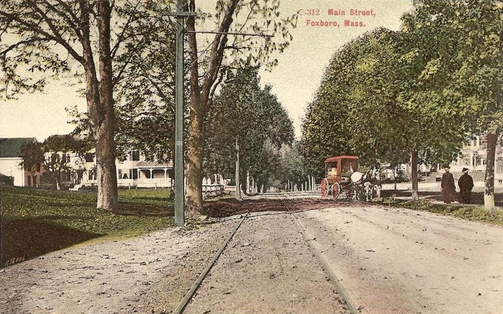 Main Street, Foxborough, MA in the olden days. Back then, Foxborough Movers had flat-bed trains to push and pull furniture. Photo by Unknown photographer, Public domain, via Wikimedia Commons